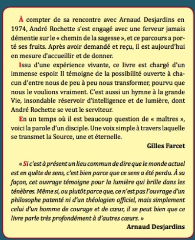 « Tout ce que j’étais en mesure de partager de ce que j’avais trouvé en Asie, André Rochette l’a assimilé avec passion et mis en pratique avec acharnement. A travers ses doutes, ses révoltes, ses violences, il a redécouvert les clés simples, bien connues autrefois et bien méconnues aujourd’hui , du chemin qui conduit à la paix, à la joie et à l’amour. Sans aucune prétention de sa part à un quelconque titre de sage, de « libéré » ou d’ « éveillé », le changement qui s’était opéré en lui a peu à peu attiré les demandes de nombreuses personnes convaincues qu’elles pouvaient trouver auprès d’André Rochette l’aide qu’elles souhaitaient… Parce qu’il a l’expérience de l’existence au coeur des joies et des peines qui sont celles de la plupart de nos concitoyens et parce que c’est son coeur qui s’exprime, il sait parler, trouver les mots qui touchent, qui inspirent, qui redonnent l’espérance »