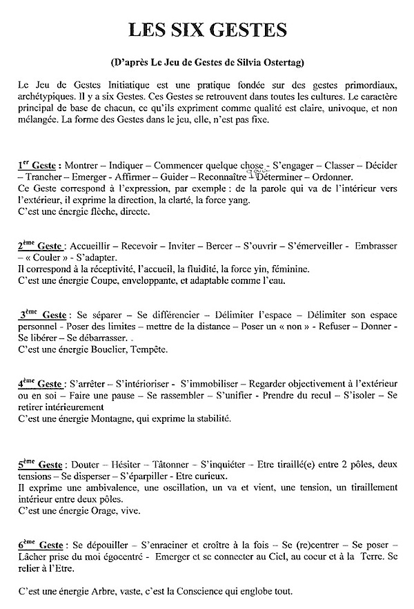 Pour ma part, et en réponse à la demande générale, je vous communique ci dessous le texte que m’a remis Elisabeth à l’issue du stage et qui présente de façon synthétique les « 6 gestes » que nous avons expérimenté avec elle comme support privilégié de nos prises de conscience.