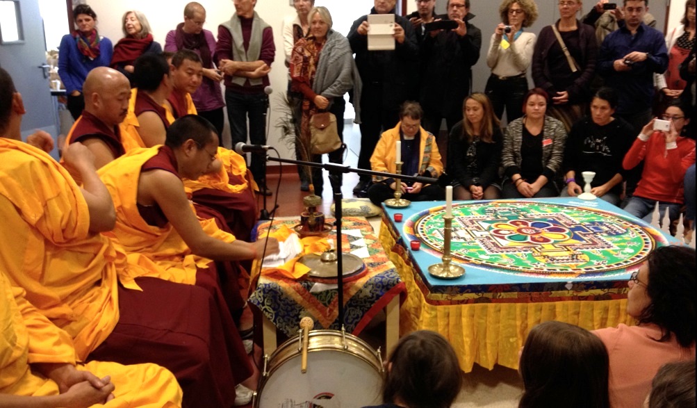Histoire de « sentir » l’ambiance du lieu où nous nous retrouverons dimanche prochain à l’occasion des 24h de méditation pour la Terre, j’ai été avec Anne-Marie passer l’après-midi au Centre Culturel Bouddhique de Rennes, qui recevait ce week-end un groupe de moines tibétain et leur maître Thekchen Rinpoché, entre autres pour la réalisation du Mandala de Chenrezi.