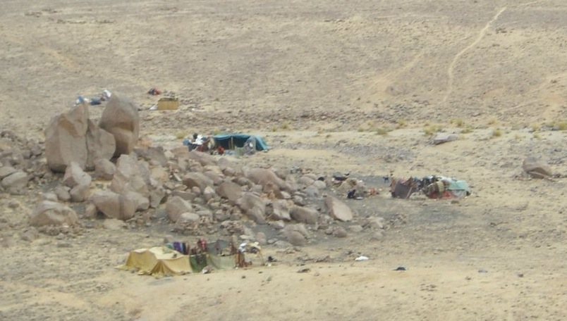 Au campement, une journée de marche plus loin, on ne m’appelait pas. Les échanges se faisaient avec le regard, le sourire, des mimiques, quelques mots. Nous avons simplement passé des moments ensemble, fait la soupe, mangé la soupe, rapporté les bidons d’eau de l’abankor*. J’ai beaucoup regardé. Les jeunes filles qui partent le matin avec le troupeau de chèvres, les enfants qui jouent avec rien, une mère qui natte les cheveux de sa fille et les enduit d’une pommade Stella jaune qui vient du Niger et sert à tout, graisser les cheveux, nourrir la peau, cicatriser les blessures. Dans un campement Touareg « l’invité » a droit au « taftar », le tapis. Tout le monde est assis à même la terre, mais l’invité s’assied sur une couverture et on lui en donne une en plus, chiffonnée qui sert de dossier. Je venais avec Intayent le guide que je connais et j’étais dans sa famille, mais quoi qu’il arrive, dans un campement une des règle de base est que lorsqu’une personne arrive, même si on ne la connaît pas, on lui donne à boire et à manger. Je logeais non loin d’une des tentes, de l’autre côté d’un petit oued. Quatre poteaux de bois et un esseber ** sur trois côtés le premier soir, ma tente, les autres nuits car un vent très froid soufflait.