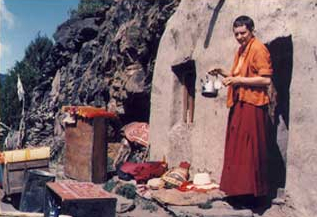 Elle a donc trouvé un endroit pour pratiquer, une grotte au dessus du monastère à 4000m d’altitude, complètement isolée par la neige durant 6 à 8 mois, une vue à couper le souffle sur les montagnes, de l’eau pas très loin, juste la place à l’intérieur pour le caisson de méditation, un réchaud et quelques livres. Elle décrit cet endroit comme le paradis sur terre. Elle y restera 12 ans à pratiquer la méditation. Beaucoup de gens sont impressionnés par son courage physique, sa manière tranquille de supporter l’isolement, le froid, l’inconfort, les privations, les loups, sans parler des démons insoupçonnés auxquels une pratique de la méditation en continu ouvre la porte… C’est plus ce dernier aspect qui m’impressionne, la stabilité et la confiance que la solitude et la pratique intensive requièrent. Confiance en la vie et confiance en son maître qu’elle retourne voir régulièrement avec sa liste de questions.