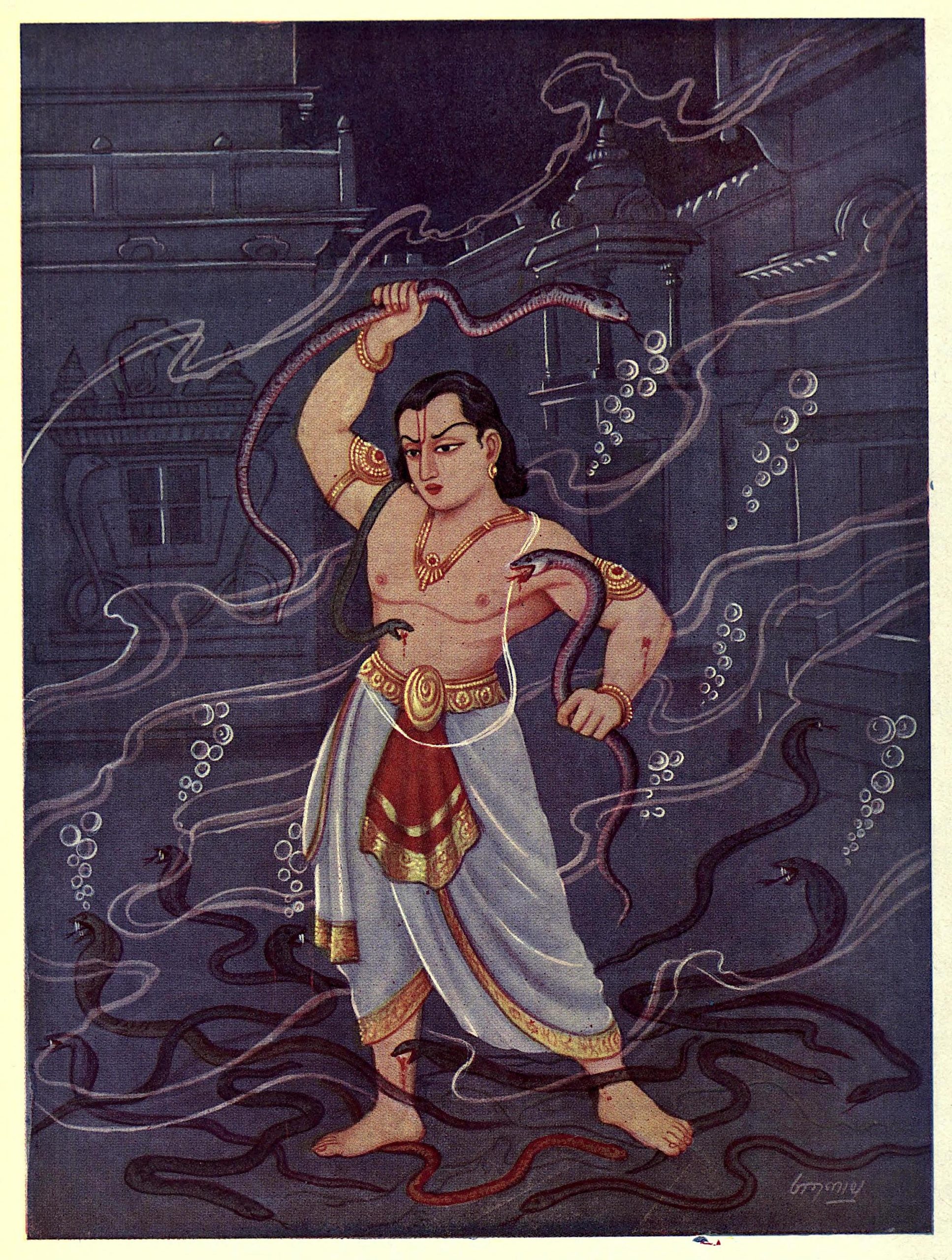 Si le destin ne s’en était pas mêlé, c’est en effet ce qui, en toute logique, aurait dû se produire… Mais le fond des rivières, on le sait, est l’un des repères favoris des Nâgas, ces créatures subtiles que nous avons déjà rencontrées dans l’épisode 3 consacré au grand sacrifice des serpents, car c’est sous cette forme qu’ils apparaissent le plus souvent aux humains. Et nous savons aussi depuis l’épisode 4 qu’il s’agit d’une classe particulière d’asuras (démons). Or au fond de l’eau, Bhîma fut attaqué et mordu par plusieurs de ces êtres malfaisants. Mais au lieu de le tuer, leur venin agit comme un antidote au poison que Duryodhana avait mis dans sa nourriture. Bhîma sortit donc de son coma et à l’aide de sa force herculéenne, se libéra en un tournemain des cordes qui l’entravaient avant de se mettre sur-le-champ à combattre vaillamment ses agresseurs serpentins.