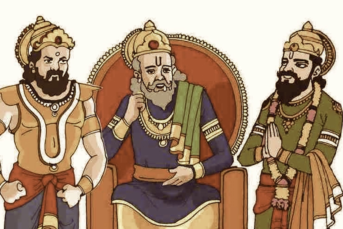 Mais ceci étant, comme il s’agit d’un ancêtre très éloigné par rapport au coeur de l’histoire, le texte ne s’y attarde pas outre mesure et se contente ensuite de nommer brièvement ses descendants pour arriver, une vingtaine de générations plus tard, aux aïeux directs de nos héros. Sachez tout de même que parmi la descendance de Bhârata, on trouve deux noms intéressants à connaitre, car en lien avec la partie centrale du récit.