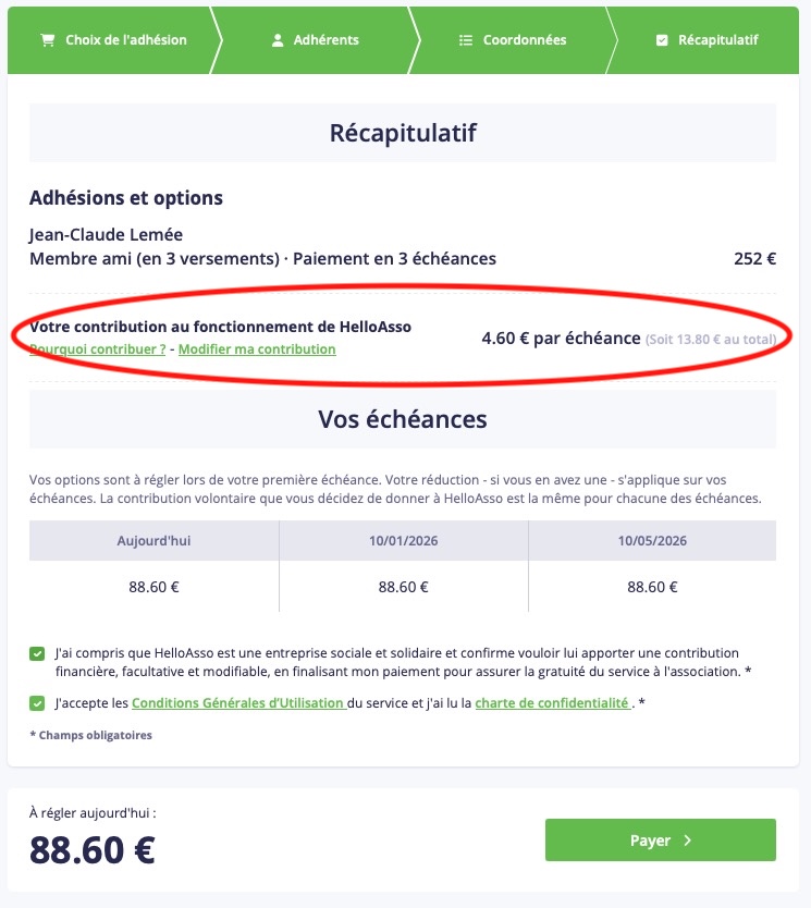 - Conformément à ce qui a été expliqué lors de l’AG, la cotisation « Ami » peut désormais être réglée en trois fois sur HelloAsso. Si vous choisissez cette option, vous serez prélevé d’un montant de 84€ le jour de votre adhésion, puis d’un montant équivalent le 10 janvier et le 10 mai, soit un total de 252€. Merci dans ce cas de vérifier que la date de validité de votre carte bleue est postérieure à la date du 3ème prélèvement (10 mai 2026), sous peine de quoi, la dernière échéance ne pourra pas être honorée…