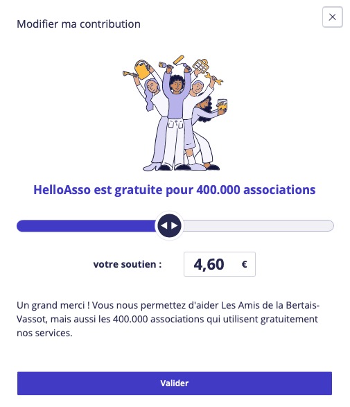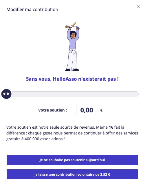 - Le règlement en ligne n’implique aucun frais bancaires, mais à la fin de la procédure, notre partenaire HelloAsso vous proposera de lui laisser un pourboire modulable. Pour le réduire ou l’annuler, cliquez sur « moduler » puis modifier la position du curseur comme montré ci-dessous.